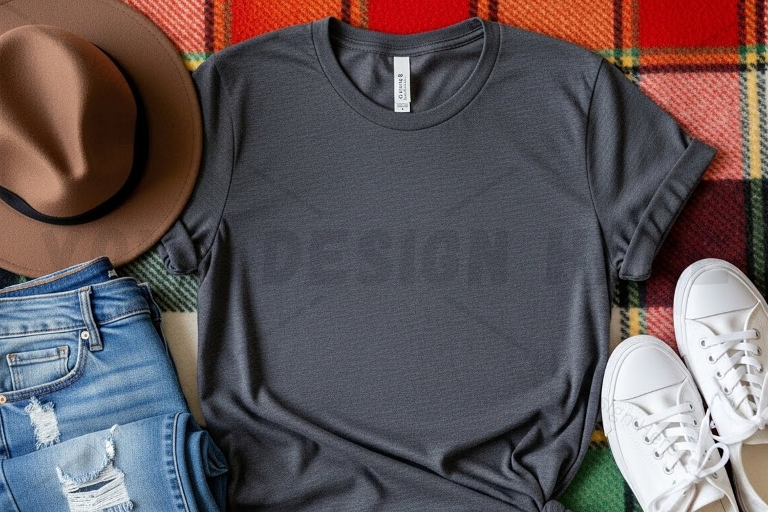 T-shirt Mockup Design Plaid Background Grey T-shirt Casual Wear Ripped Jeans White Sneakers Casual Outfit Brown Hat Everyday Comfort