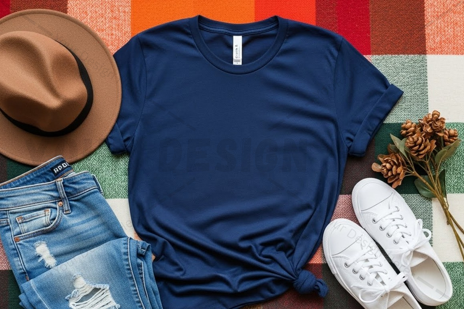 Fashion T-shirt Mockup Jeans Fedora Sneakers Dried Flowers Plaid Background Blue T-shirt Casual Wear