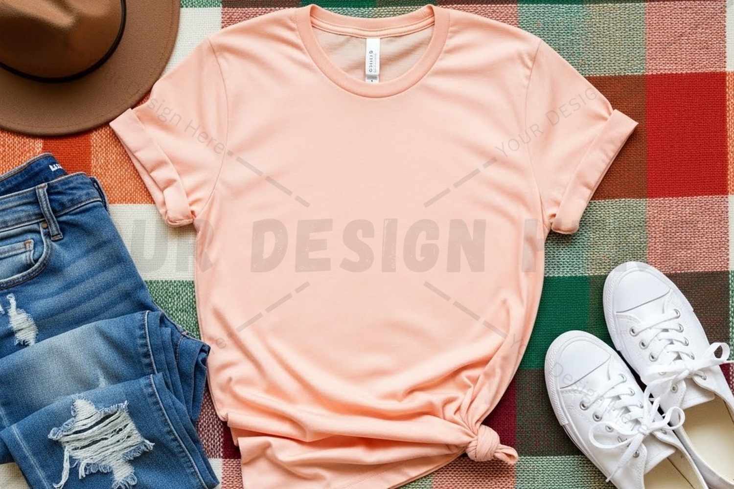 Trendy Fashion T-shirt Mockup Jeans Peach Pink Plaid Blanket White Sneakers Casual Outfit Brown Hat