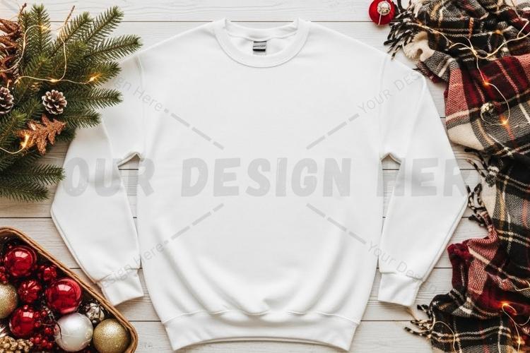 Ornaments Holiday T-shirt Christmas Mockup White Plaid Sweater Pinecones Wooden Surface