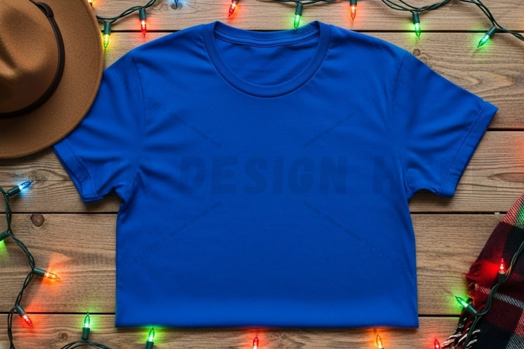 Holiday T-shirt Mockup Festive Christmas Lights Design Template Blue T-shirt Casual Wear Wooden Surface Brown Hat