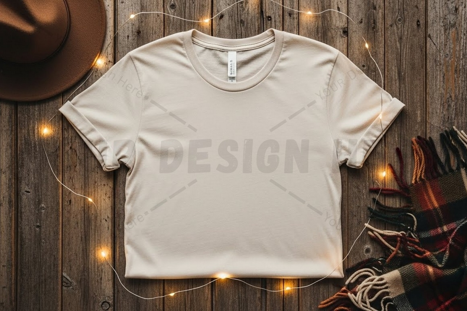 Decorative Rustic Design T-shirt Mockup Wooden Background White Blank Lights