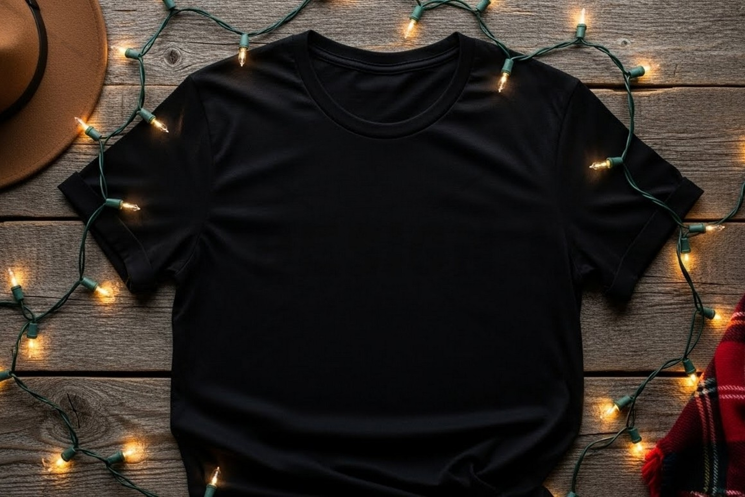 T-shirt Christmas Mockup Apparel Holiday Lights Festive Custom Design Black T-shirt Wooden Surface Holiday Promotion