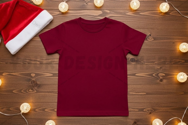 Holiday T-shirt Christmas Mockup Apparel String Lights Santa Hat Festive Wooden Background Red T-shirt