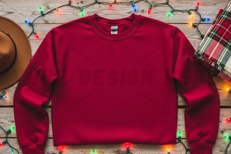 Holiday Design T-shirt Christmas Mockup Red Lights Festive Sweater Wooden Background