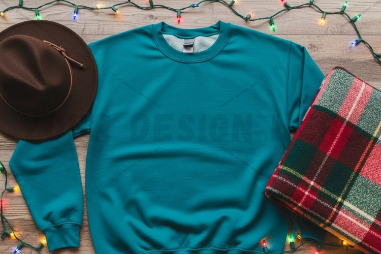 Fashion T-shirt Clothing Mockup Teal Christmas Lights T-shirt Design Plaid Blanket Wooden Surface Brown Hat