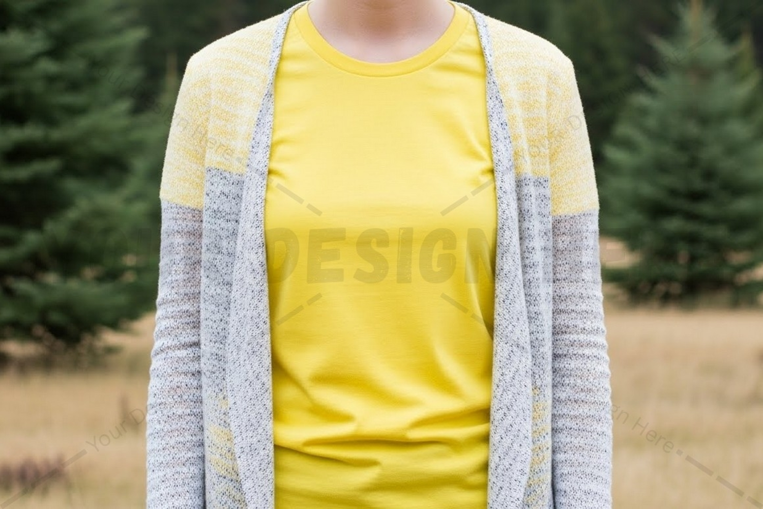 Bright yellow t-shirt with gray knit cardigan t-shirt mockup