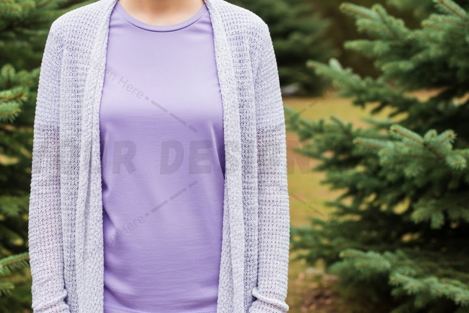 Lavender t-shirt with white cardigan outdoor mockup design example image 1