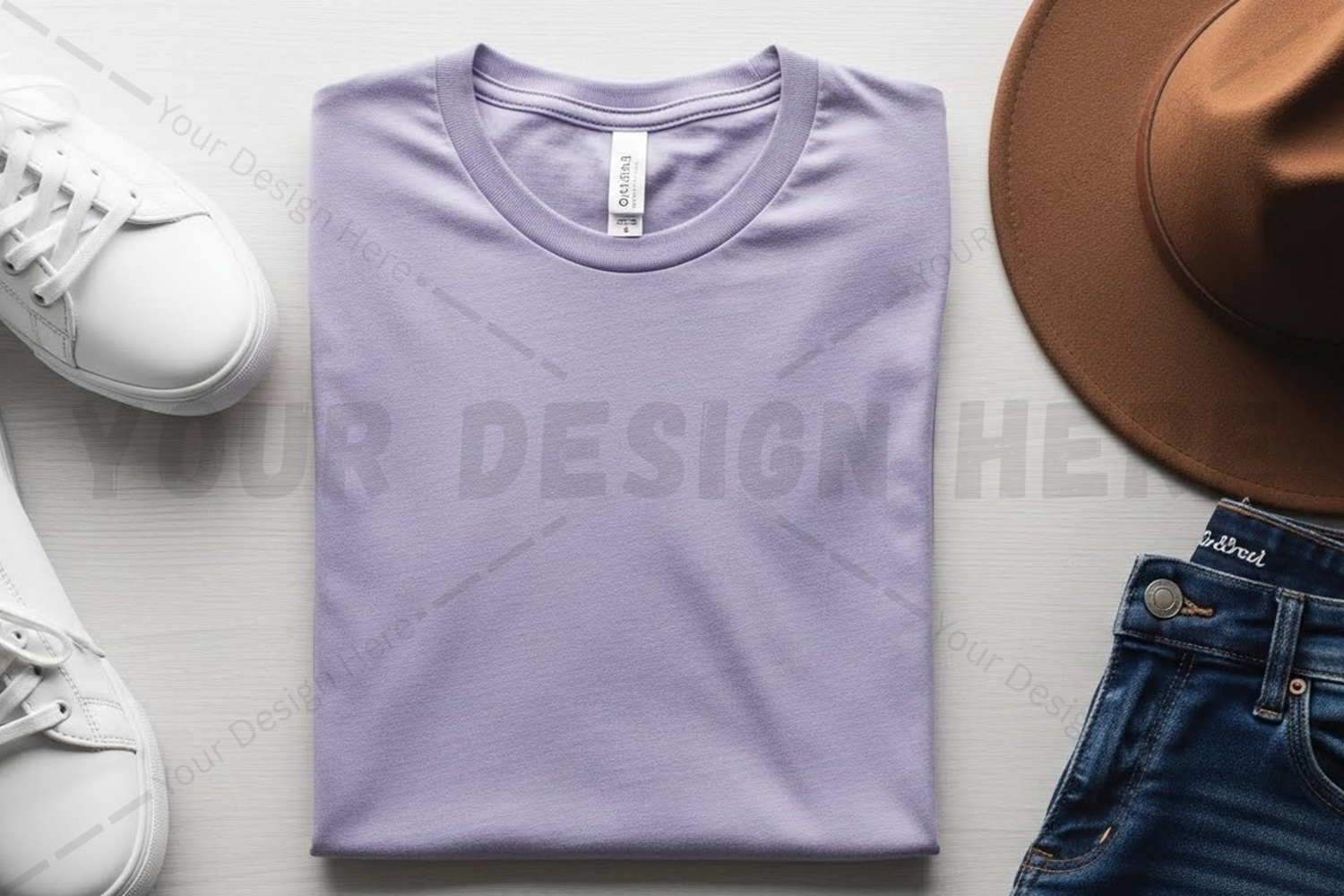Fashion T-shirt Clothing Mockup Lilac T-shirt Design Casual Wear White Sneakers Wooden Surface Brown Hat