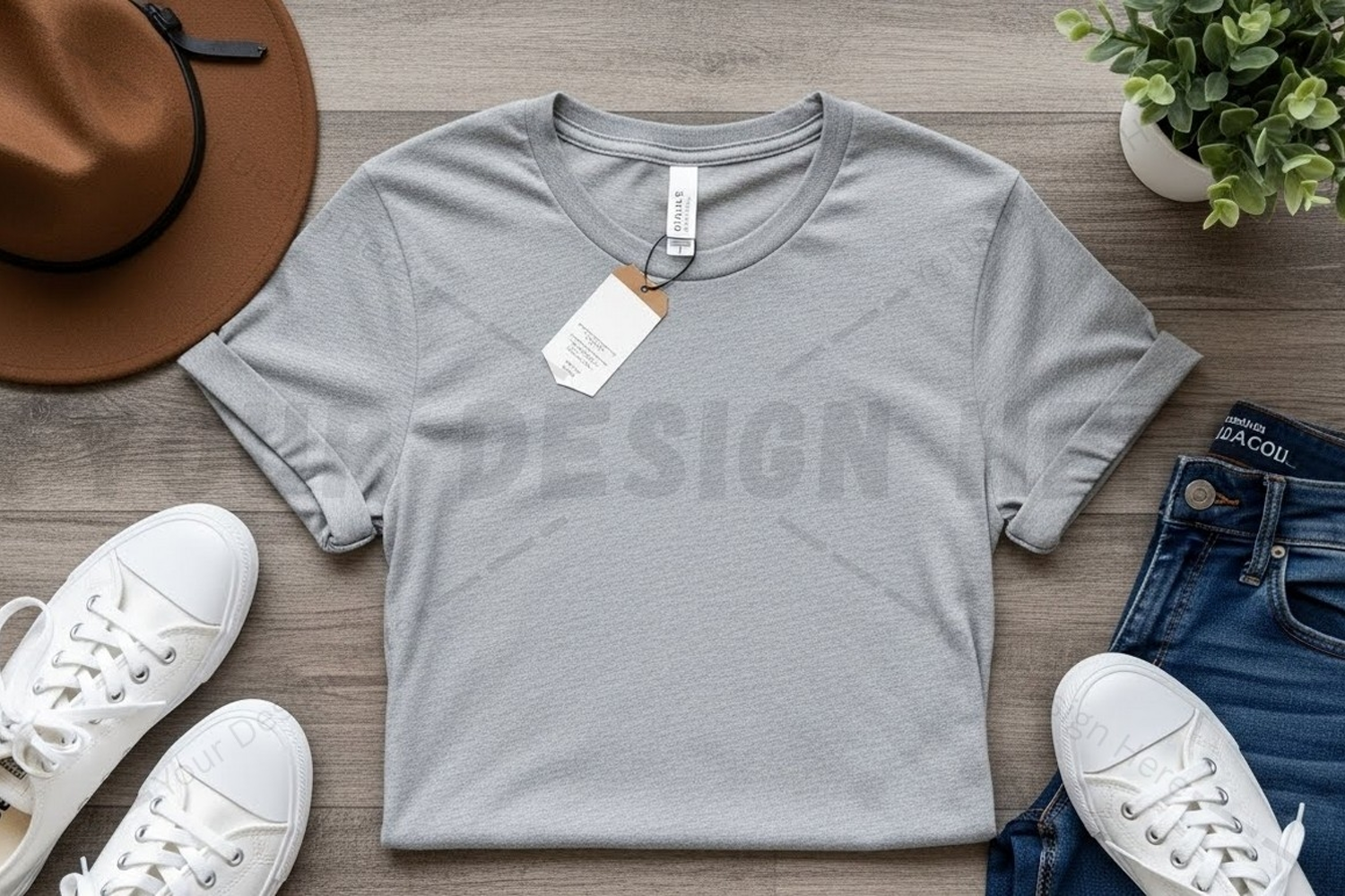 T-shirt Mockup Plant Jeans Hat Sneakers Wooden Background Light Gray Casual Wear Casual Outfit