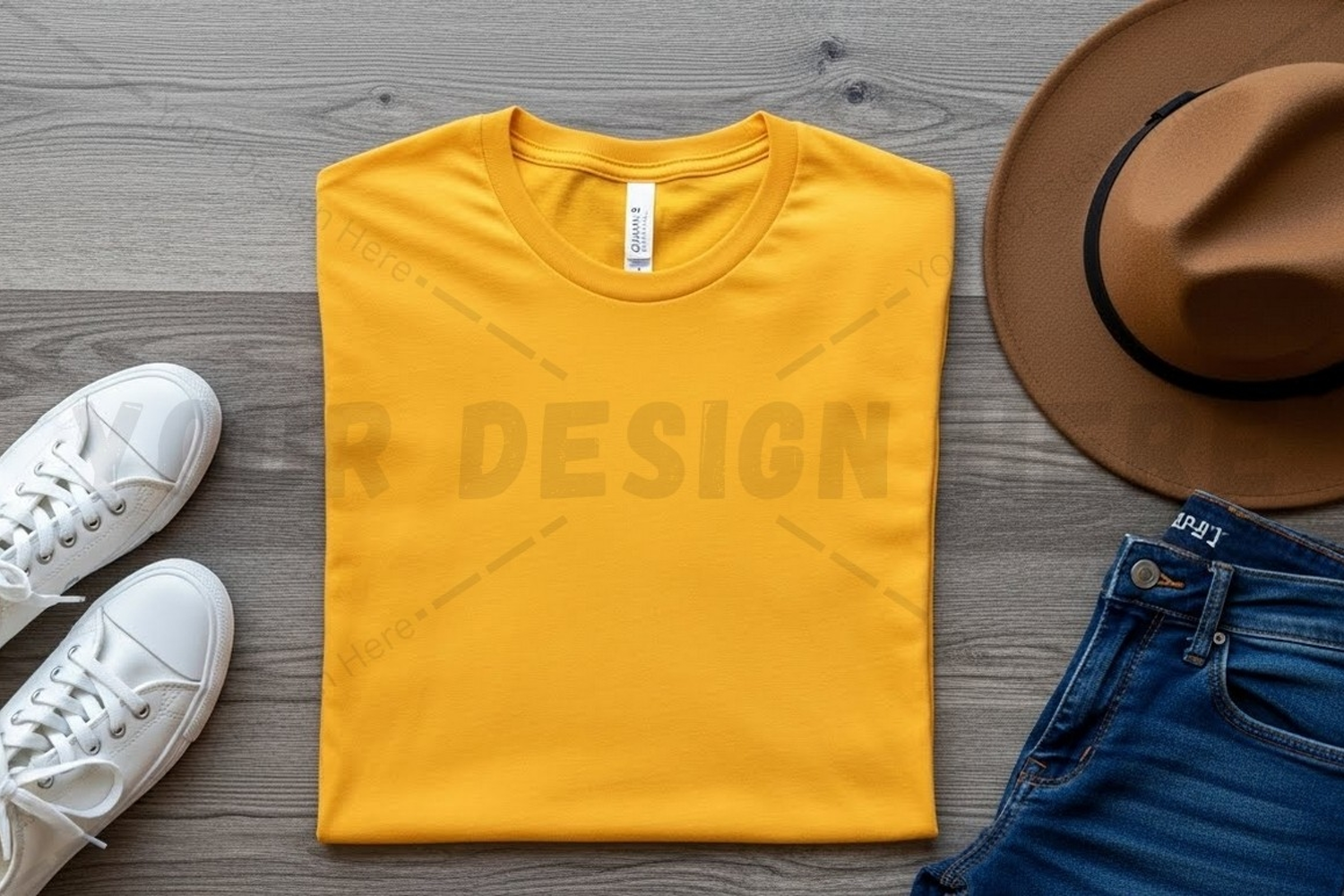 Fashion T-shirt Clothing Blue Jeans T-shirt Mockup Casual Wear White Sneakers Wooden Surface Yellow T-shirt Brown Hat