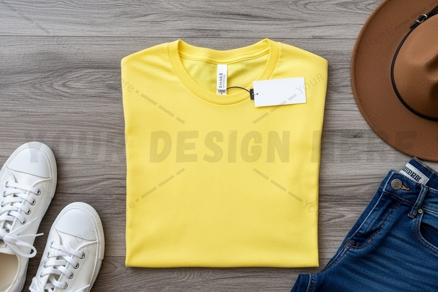 Fashion T-shirt Mockup Yellow Blue Jeans Casual Wear White Sneakers Wooden Surface Everyday Style Brown Hat