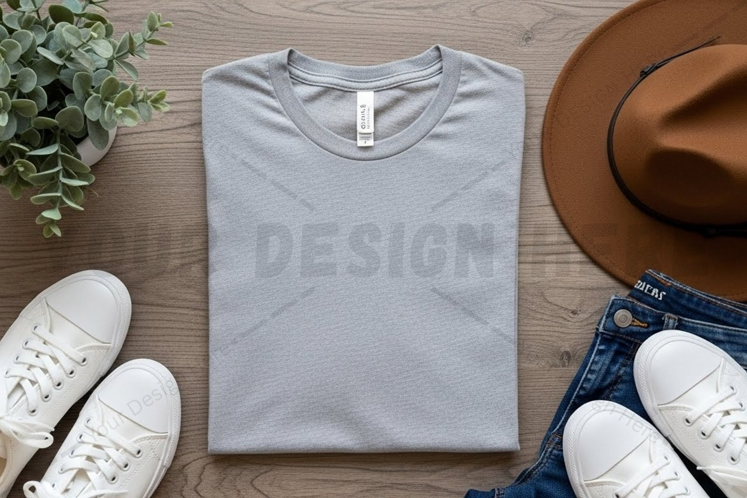 T-shirt Plant Jeans Mockup Design Grey T-shirt Casual Wear White Sneakers Wooden Surface Folded T-shirt Brown Hat