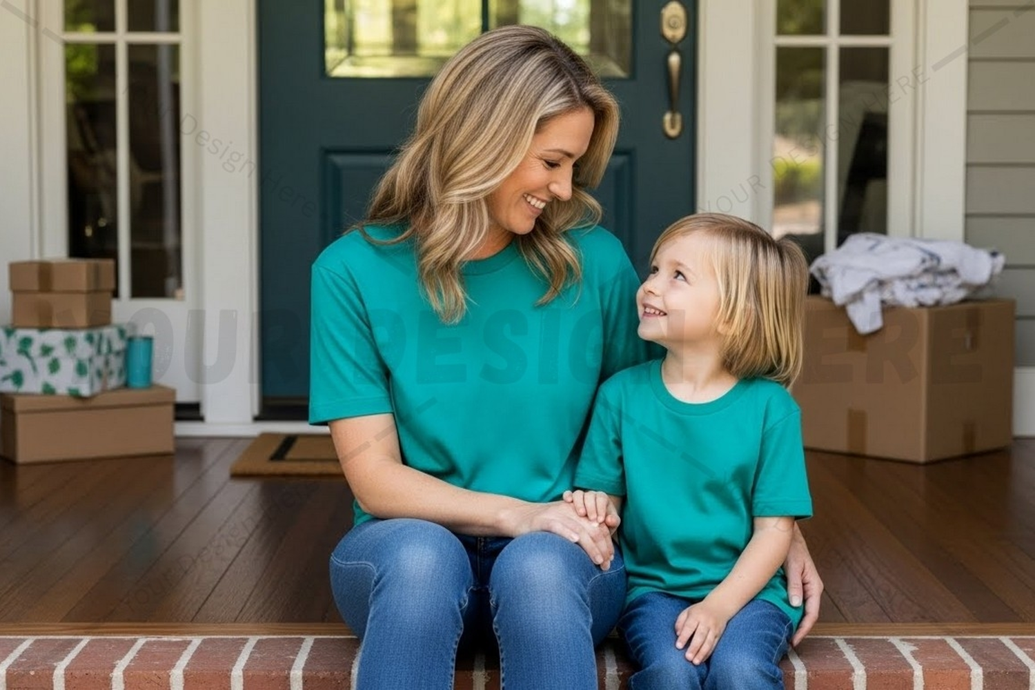Child Family T-shirt Mockup Teal Home Mother Boxes Matching Move