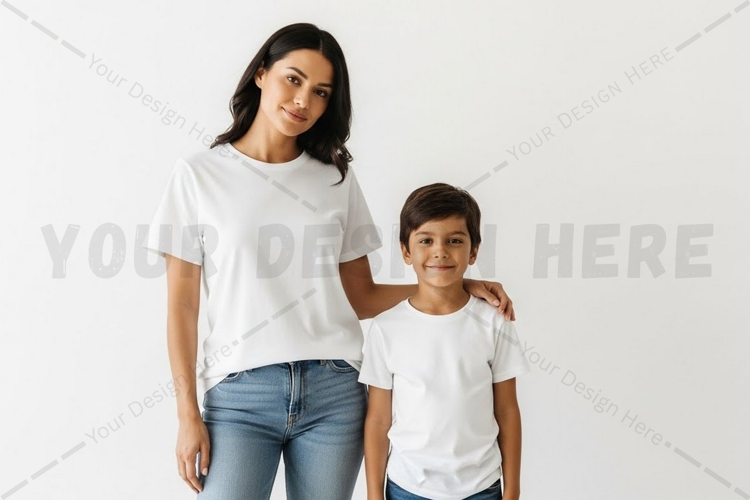 Child Family T-shirt Mockup Woman Jeans Shorts White T-shirt Casual Wear Plain Background