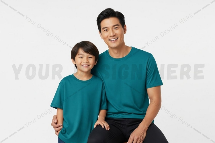 Matching teal t-shirts for father and son t-shirt mockup