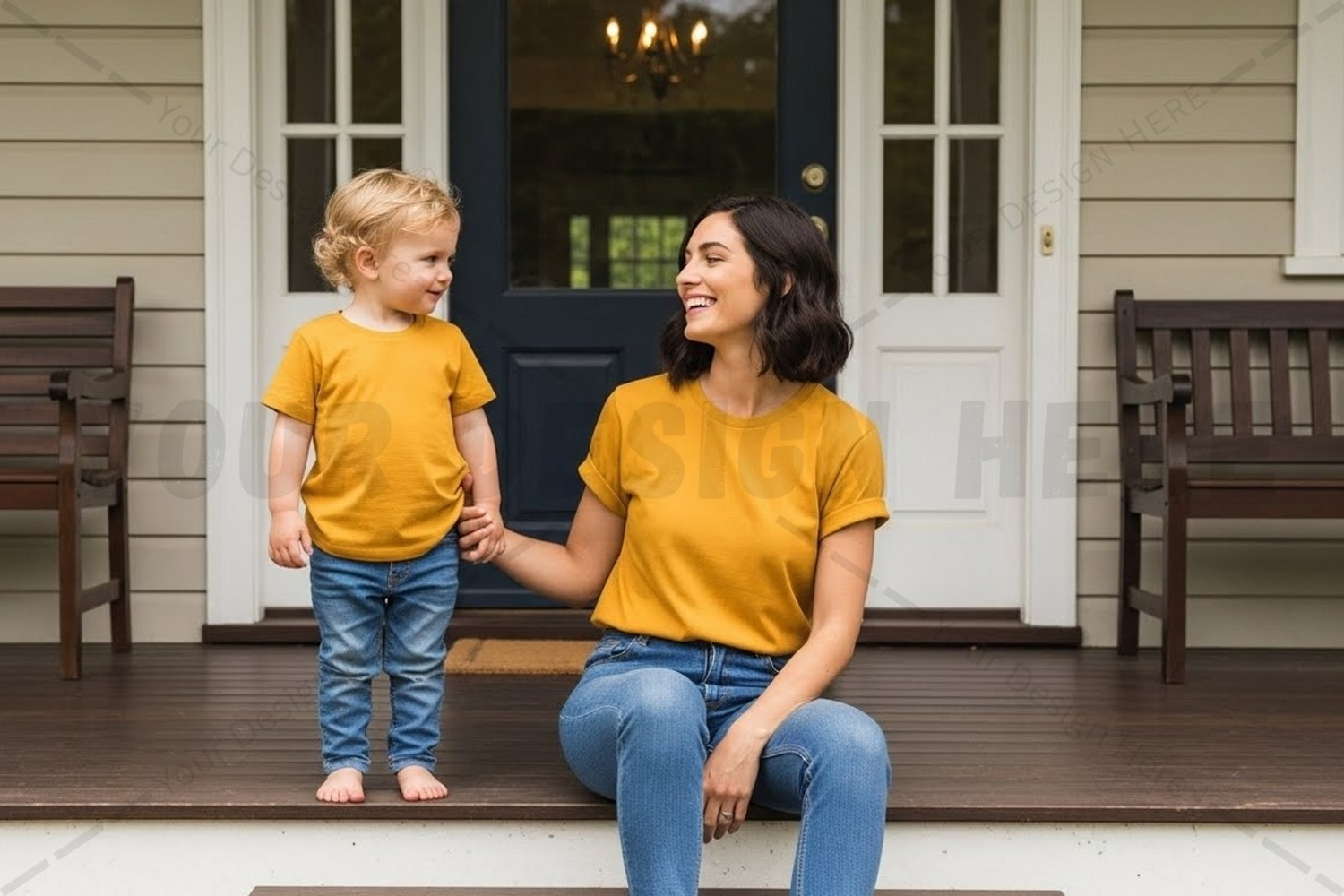Child Family T-shirt Happy Mockup Mother Smiling Porch Matching Outfits Yellow T-shirt