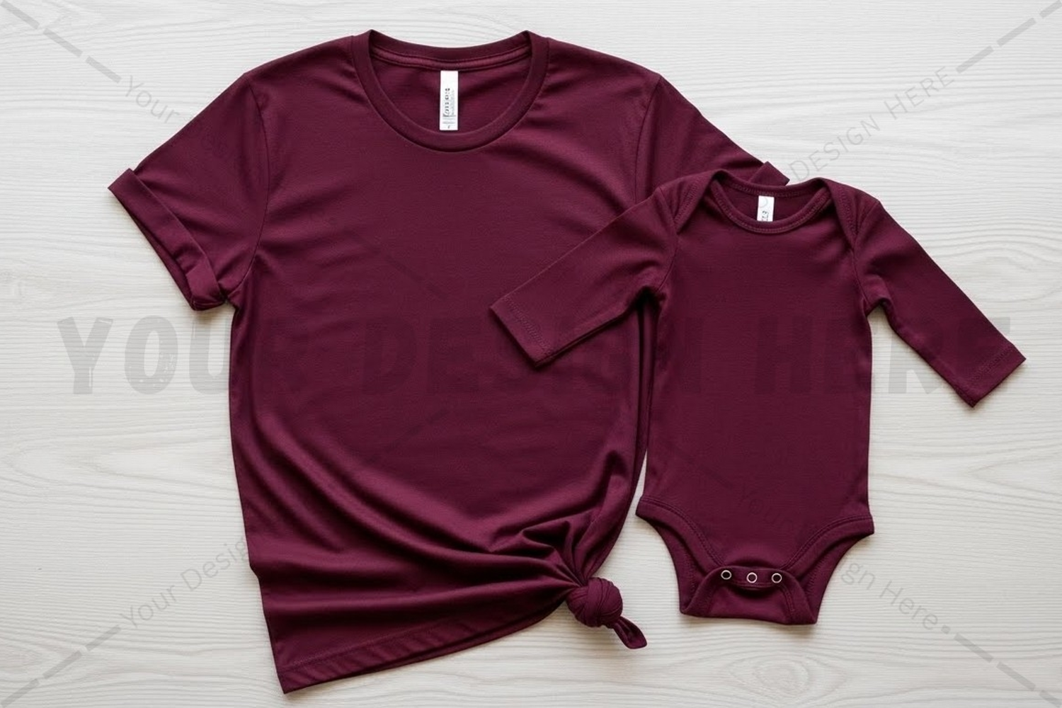 Matching maroon t-shirt and onesie set t-shirt mockup