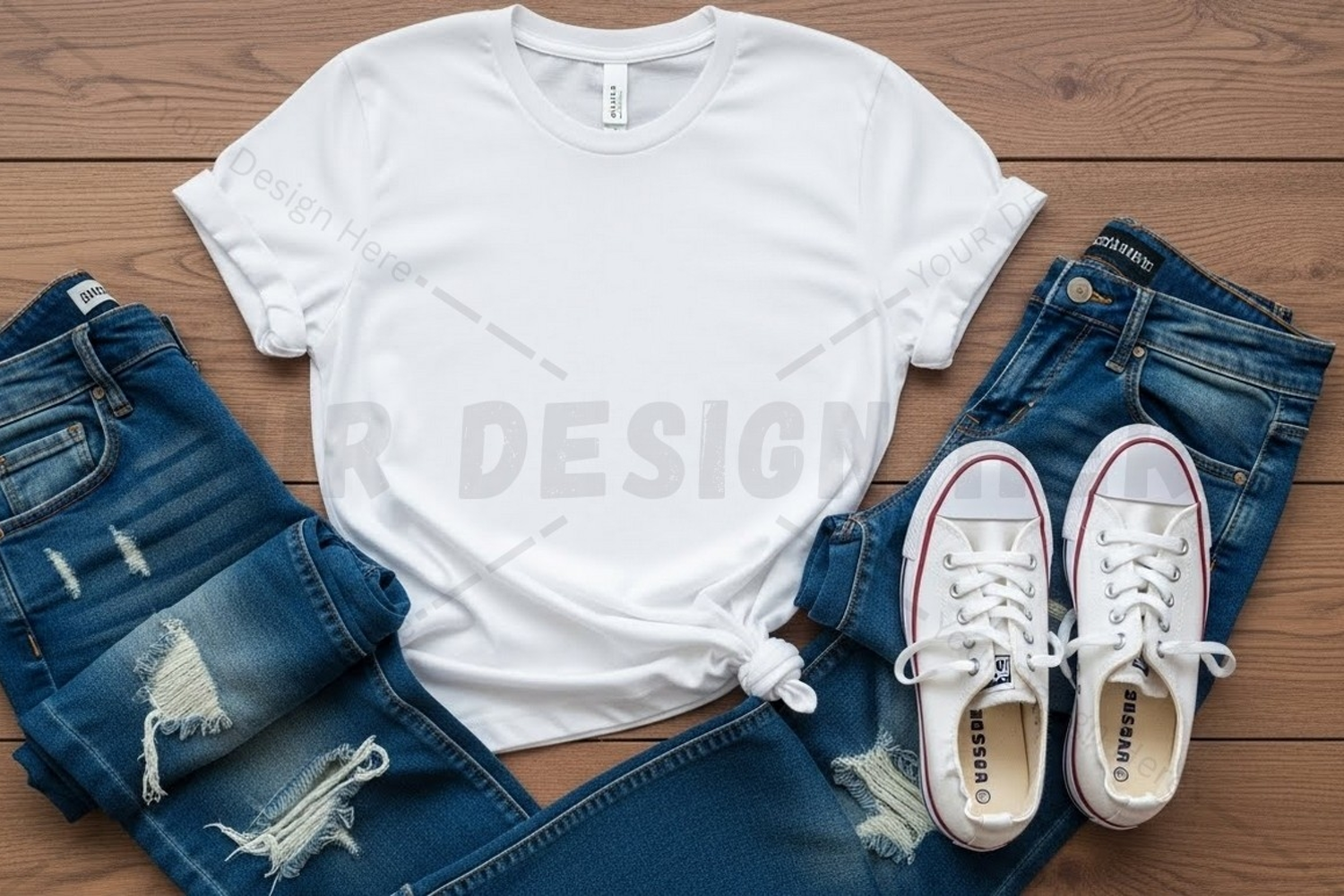 T-shirt Blue Jeans Mockup Design White T-shirt Wooden Floor Converse Shoes Ripped Jeans White Sneakers Distressed Jeans Casual Outfit