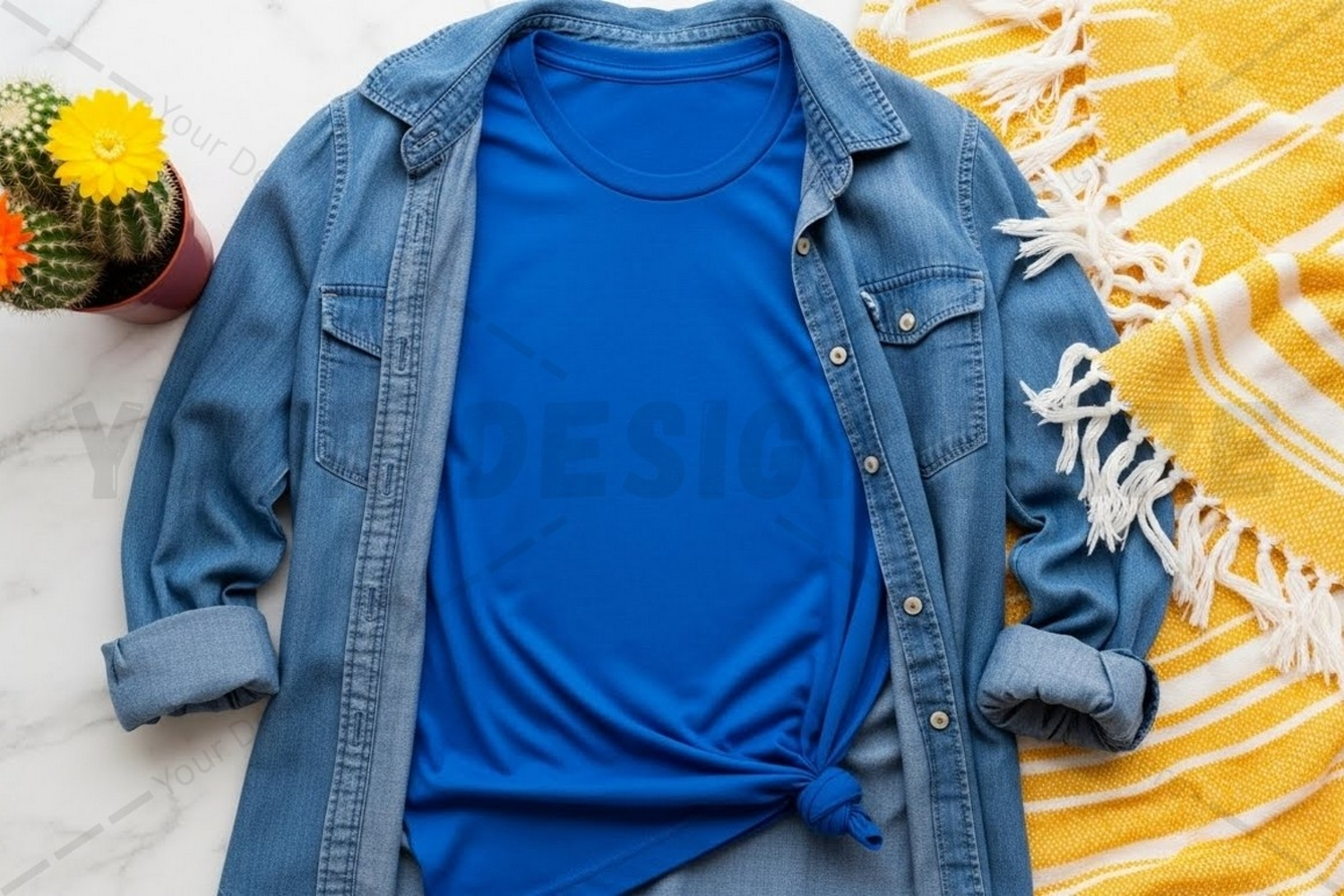 Fashion T-shirt Blue Yellow White Cactus Fringe Casual Wear Denim Jacket Marble Surface