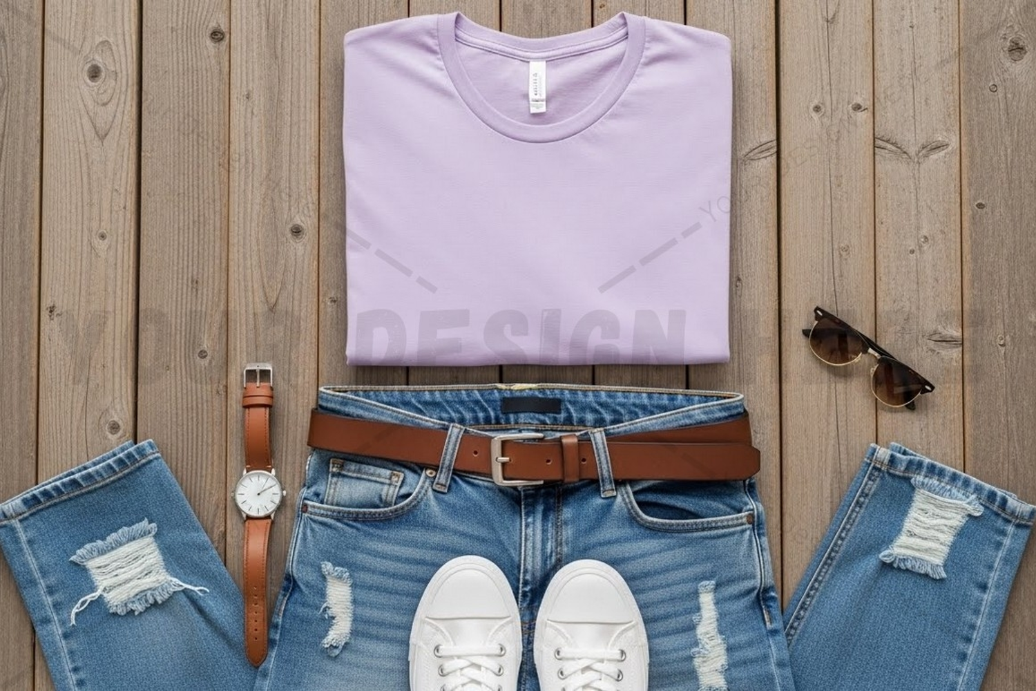 Casual summer outfit with lavender t-shirt mockup example image 1