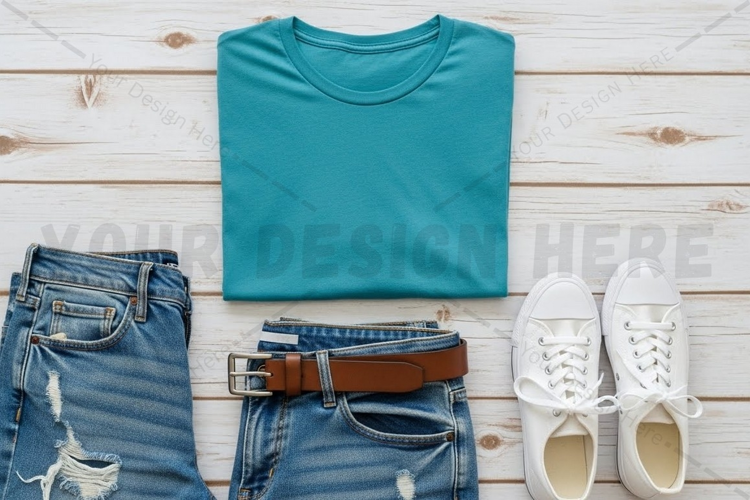 Fashion T-shirt Distressed Mockup Jeans Teal Belt Wooden Background Casual Wear White Sneakers