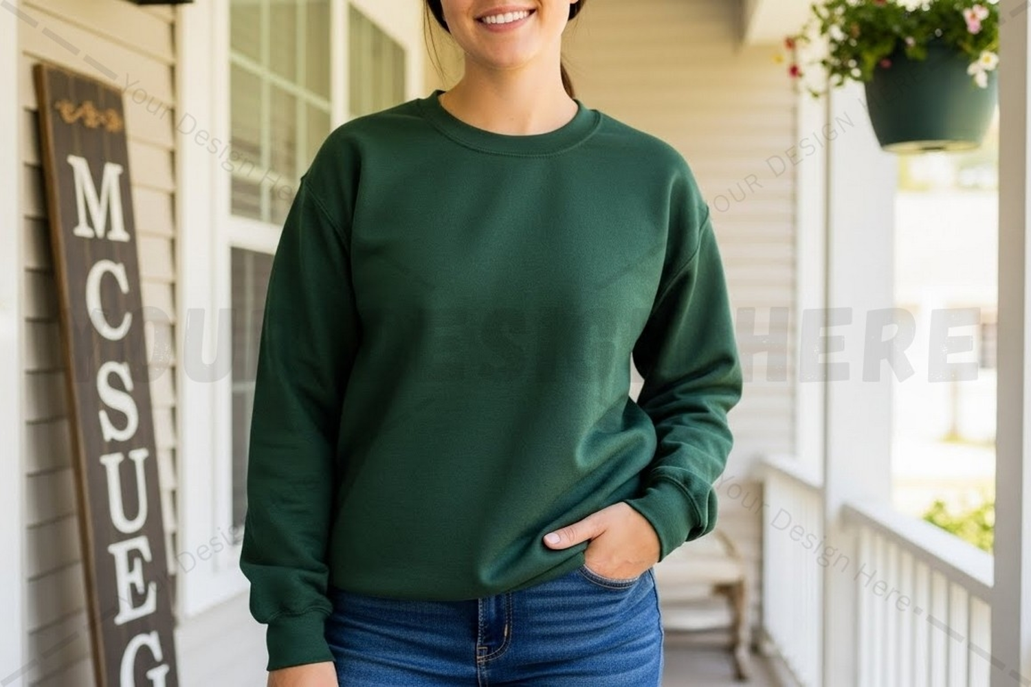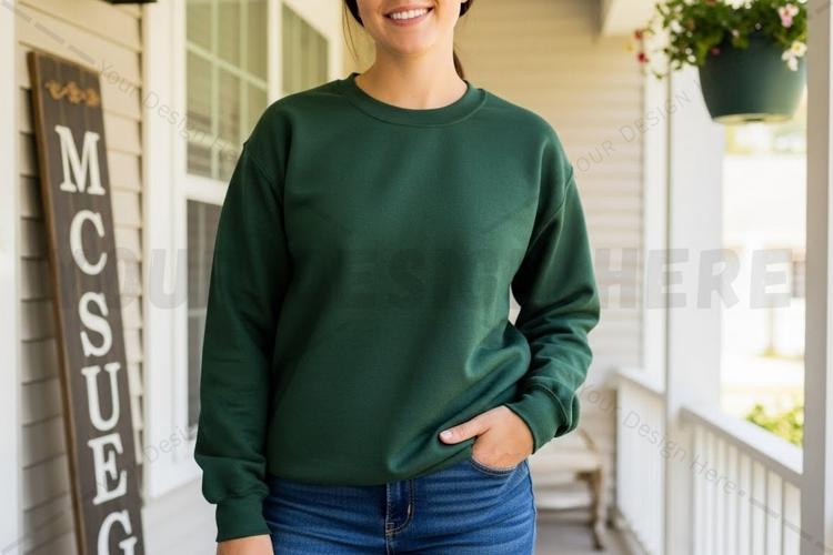 Design T-shirt Mockup Model Rustic Background Porch Long Sleeve Dark Green Crew Neck Casual Wear