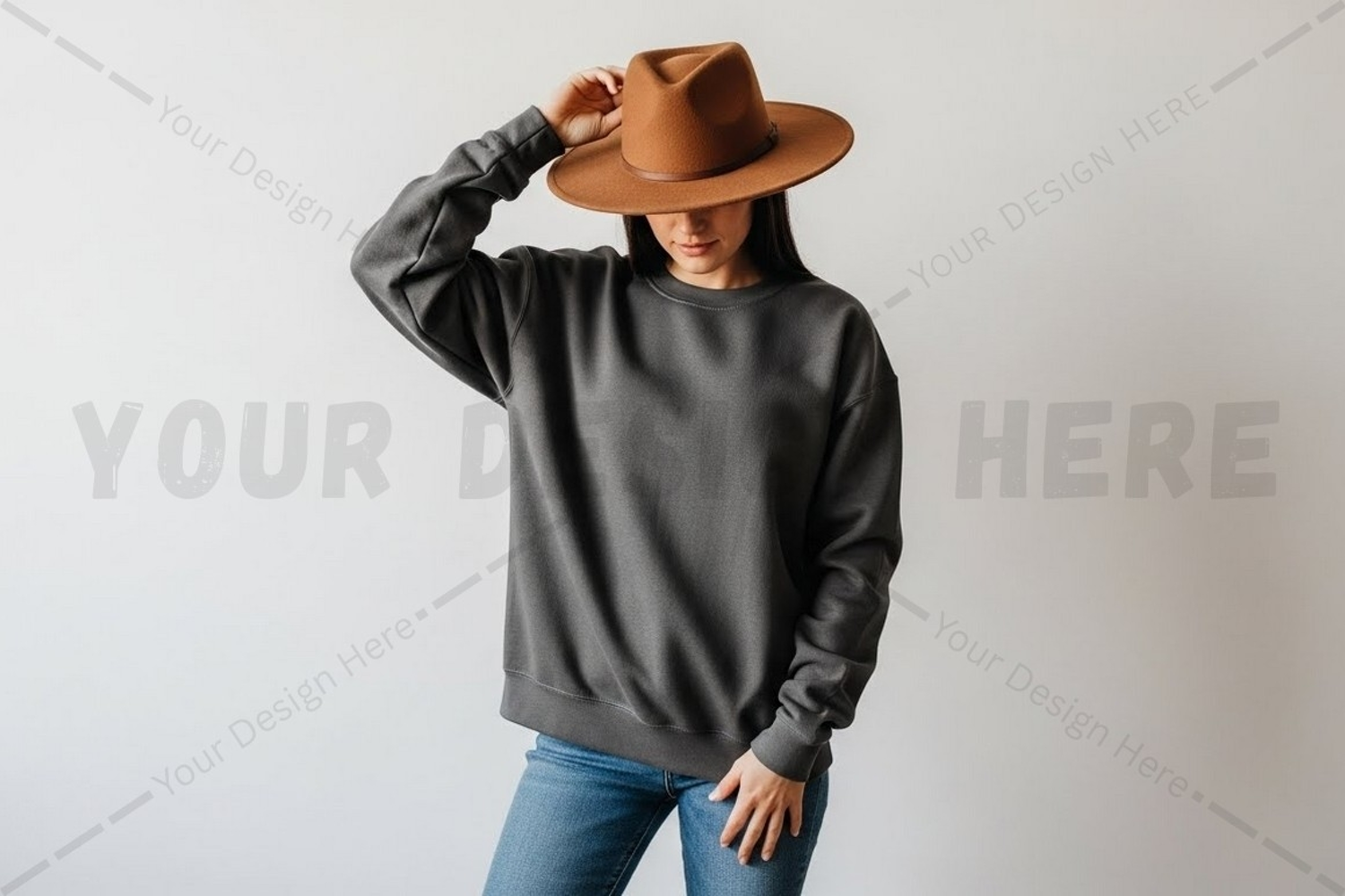 Fashion T-shirt Clothing Model Blue Jeans Mockup Design Grey T-shirt Casual Wear Brown Hat Stylish Outfit