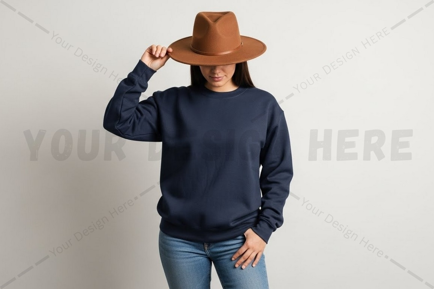 Fashion T-shirt Clothing Mockup Model Jeans Navy Blue Crew Neck Casual Wear Brown Hat