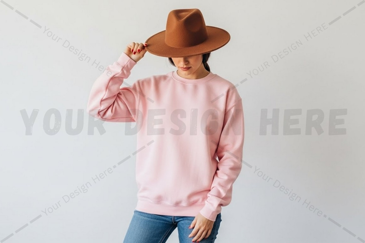 Fashion Design T-shirt Pink Mockup Street Style Crew Neck Long Sleeves Casual Wear Brown Hat