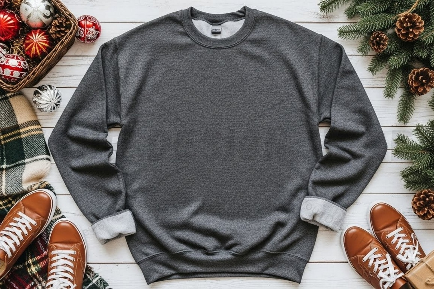 Holiday Christmas Mockup Winter Shoes Evergreen Sweatshirt Pine Cones Plaid Scarf Grey Sweatshirt