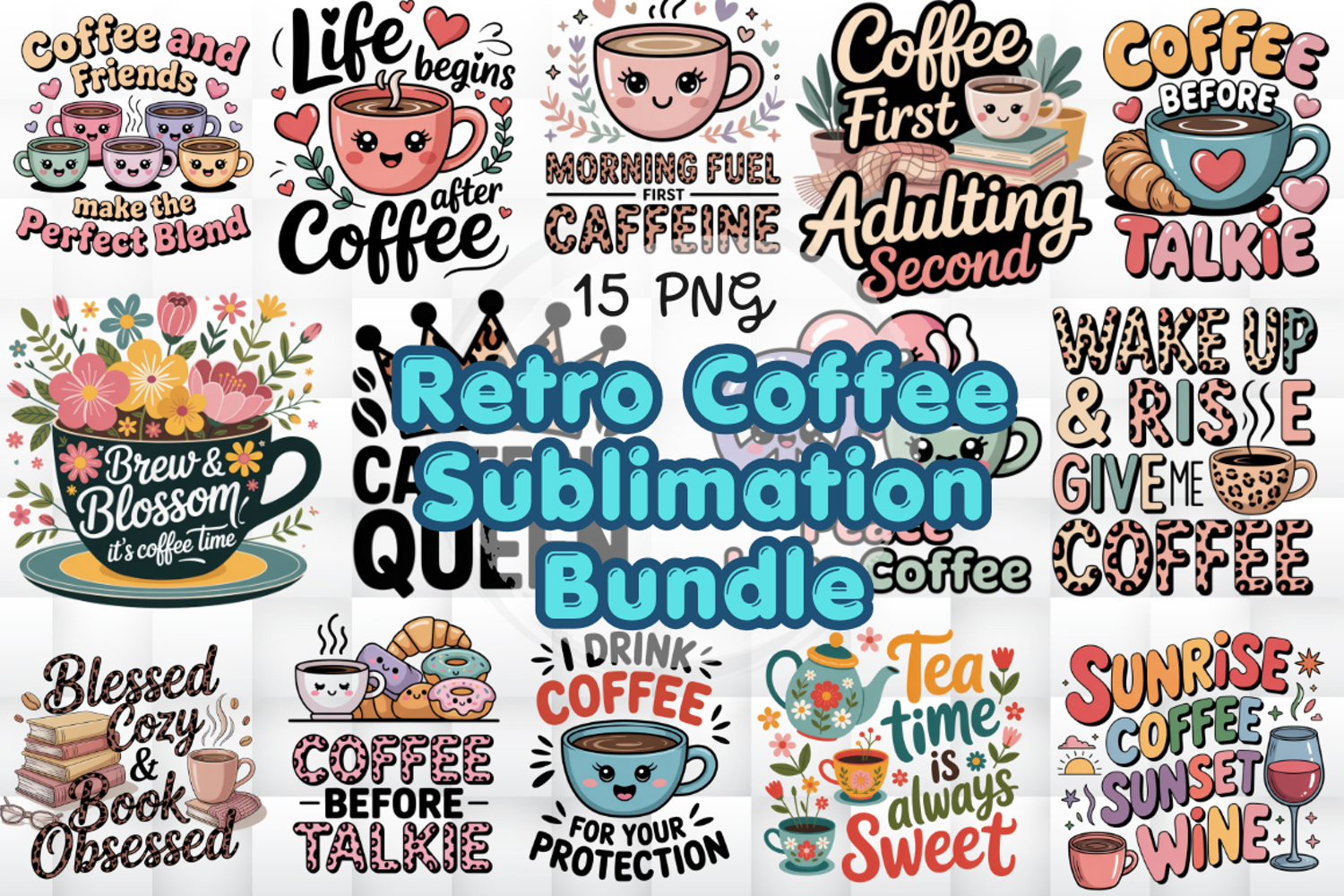 15 Retro Coffee Sublimation Bundle – Vintage Coffee Lover PNG, Cute Caffeine Quotes, Kawaii Coffee Cup Clipart, Morning Fuel Graphics for Mugs, T-Shirts, & Tumblers – High-Res 300 DPI Digital Download.