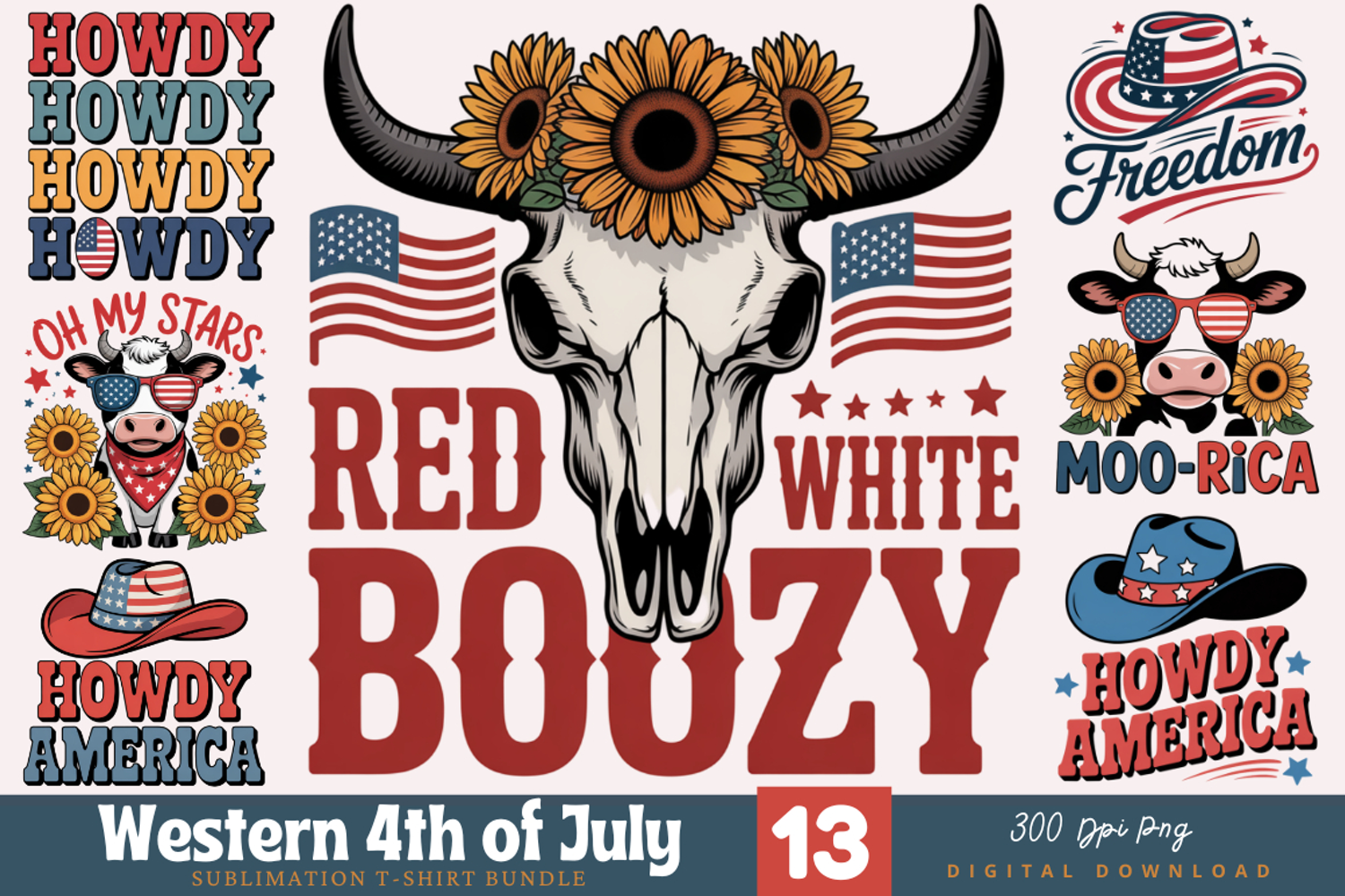 13 Western 4th of July Sublimation Bundle – Patriotic Cow Skull PNG, Retro America Howdy Graphics, Red White and Boozy Clipart, Country Patriotic Cow for T-Shirts & Mugs – High-Res 300 DPI Digital Download.