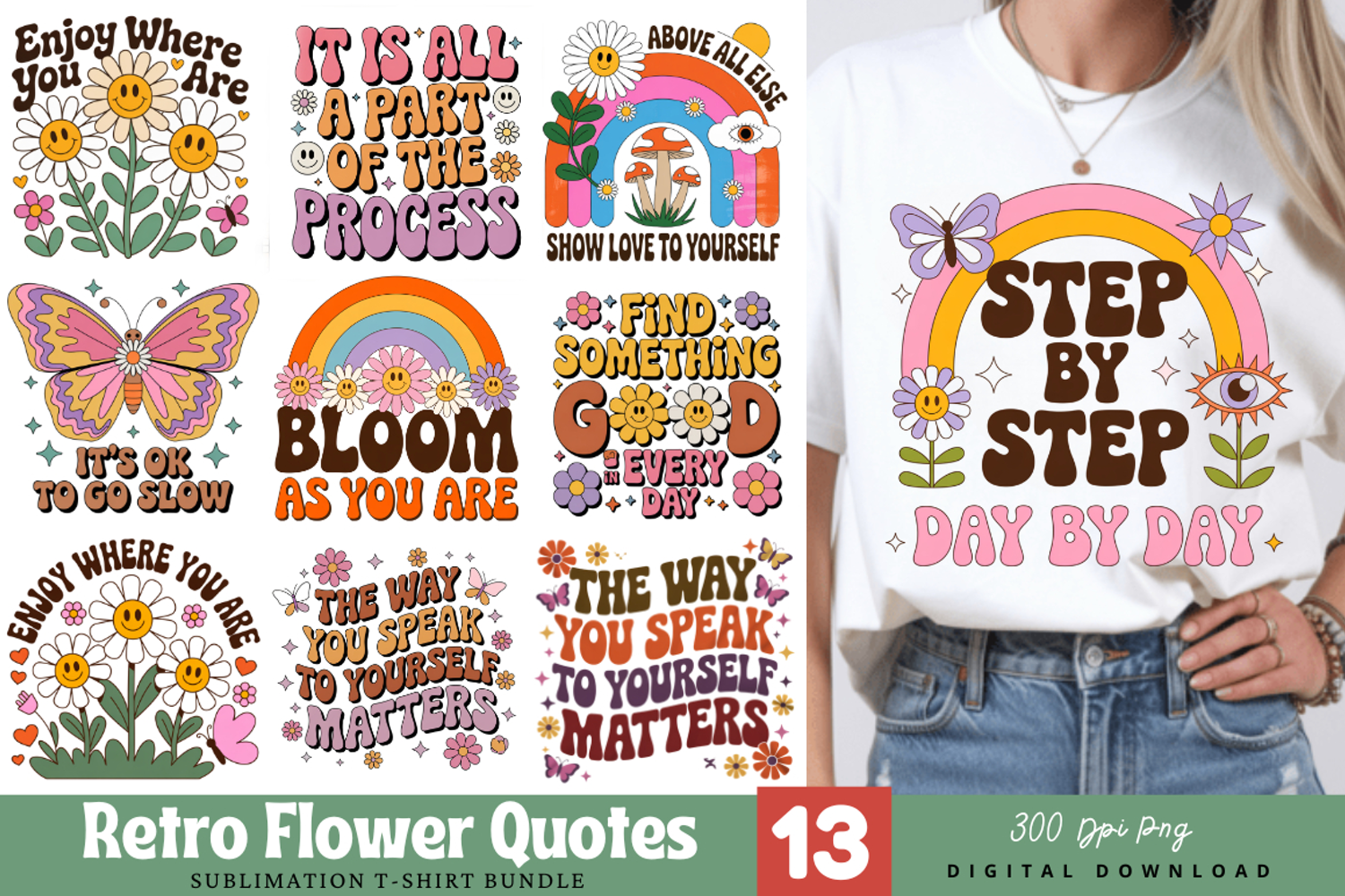 13 Retro Flower Quotes Sublimation Bundle – Vintage Groovy Floral PNG, Positive Affirmations Clipart, Hippie Butterfly Art for T-Shirts, Bloom Quotes, Motivational Botanical Graphics – High-Res 300 DPI Digital Download.