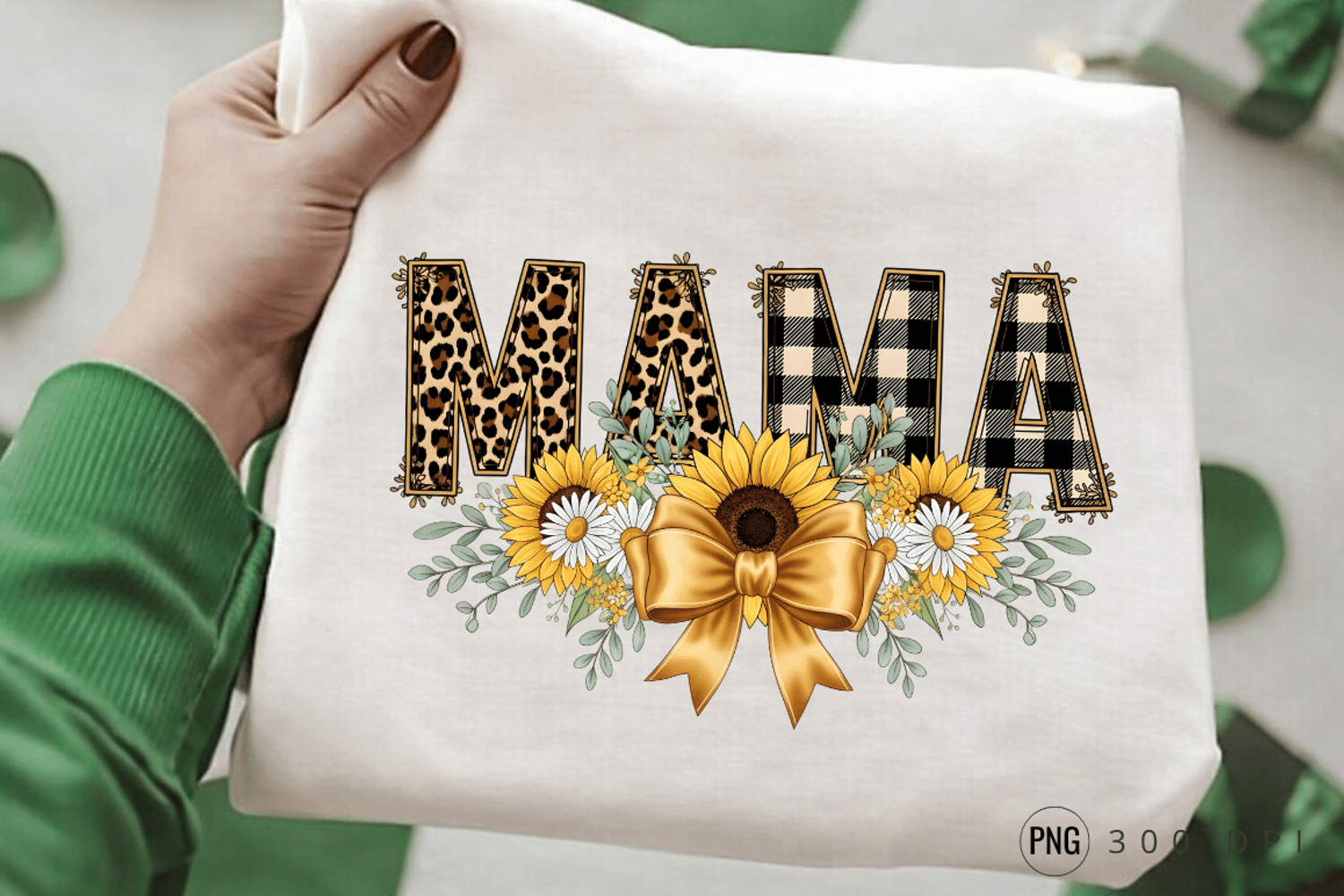 Celebrate motherhood with this premium Mama PNG Design featuring bold patterned typography and a vibrant floral arrangement. Perfectly crafted for creators, designers, and print-on-demand sellers, this design blends leopard print and buffalo plaid textures with sunflowers, daisies, greenery, and a golden bow.