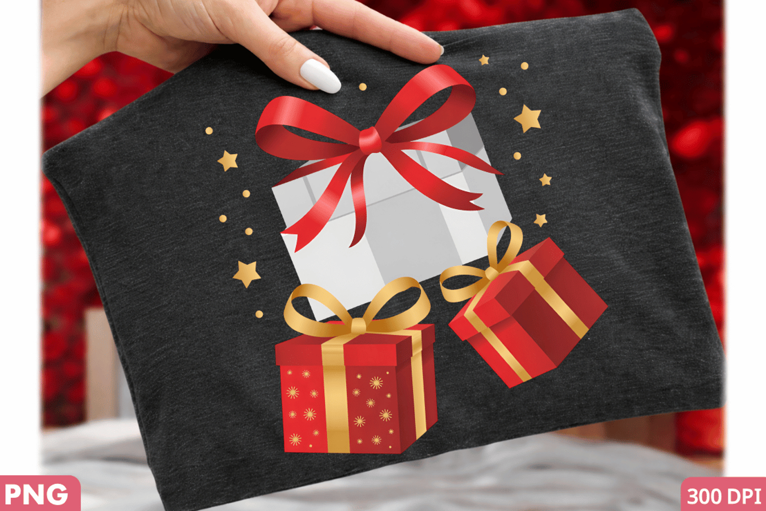 A vibrant and festive sublimation PNG design featuring two gift boxes adorned with red ribbons and stars. This design is ideal for various crafting and printing purposes, including sublimation printing on t-shirts, mugs, and other textiles. Perfect for holiday-themed projects, gift wrapping, or decorative purposes.. PNG. 300 DPI (recommended for high-quality prints). Compatible with sublimation printing for apparel, mugs, and other sublimation-friendly materials.. Suitable for direct printing on paper, fabric, or other printable surfaces.. Can be used in DIY projects, including cutting files for Cricut machines or laser cutting. advertisements, and product packaging.. High-resolution graphics for crisp and clear prints. Festive holiday theme with gift boxes and decorative elements. Easy to customize and incorporate into various design.
