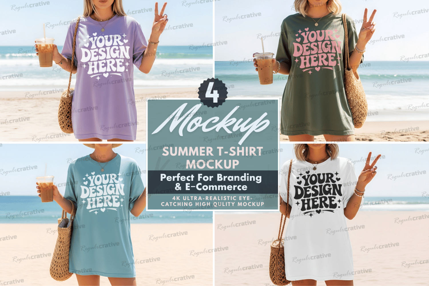 Showcase your designs with this premium Summer T‑Shirt Mockup Set featuring four realistic apparel variations in a sunny beach setting. Perfectly crafted for designers and digital makers, this mockup blends lifestyle photography with high‑quality presentation.