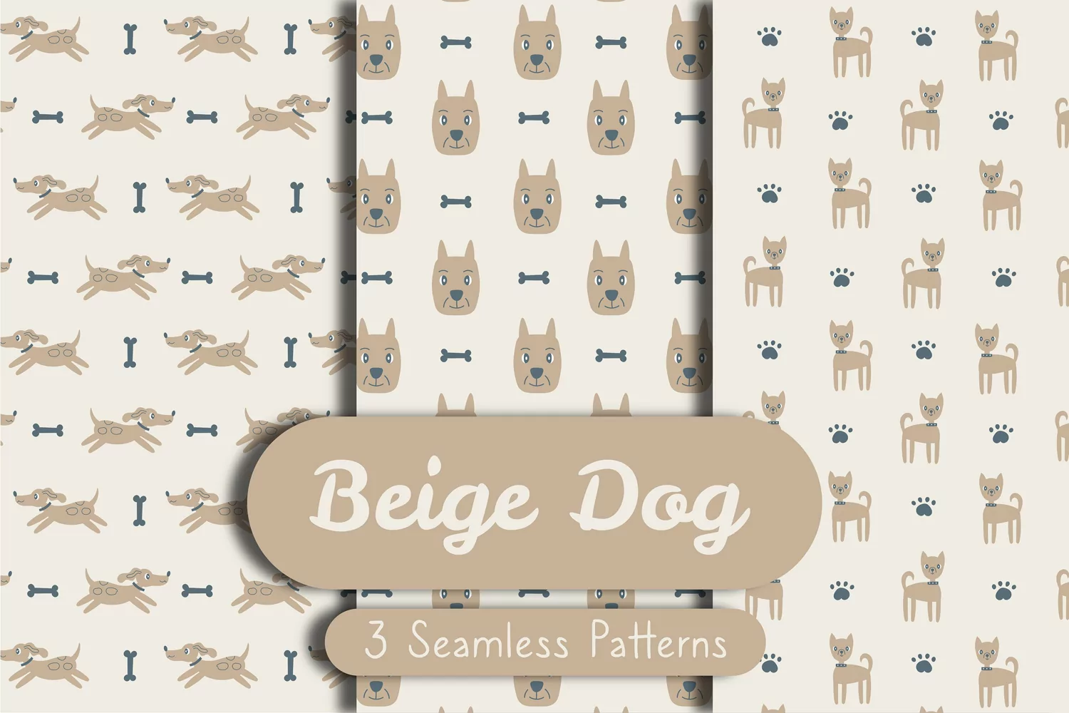 Modern hand-drawn doggy seamless patterns. Pastel colored beige endless backgrounds for pets. Neutral digital papers with cute funny animals, puppy, bone, paw print. Perfect for childish fabric, textile, wrapping paper, products for pets, wallpaper, surface. Simple minimal design.