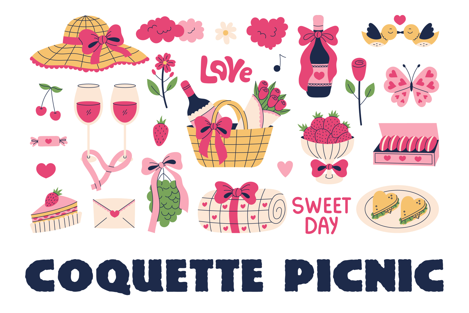 Celebrate love in the sweetest way with this Coquette Picnic Valentine’s Day Clipart Collection! This hand-drawn vector set includes adorable la dolce vita and whimsical illustrations of everything you need for a romantic picnic — a straw hat with ribbon and bow, wine bottle and glasses, basket with bouquet, grapes, cute kissing birds, heart-shaped sandwiches, macarons box, creamy slice of cake, strawberries and berries, butterfly with hearts, and many more playful kawaii doodles.