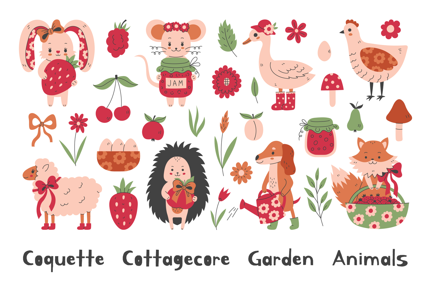 Inside you'll find adorable garden themed elements: ribbons, curly bows, spring flowers, fruits, berries, strawberries, eggs, a basket with strawberries, a watering can, boots, a sun hat, leaves, mushrooms, and sweet harvest goodies — all created to evoke that dreamy cottagecore lifestyle.