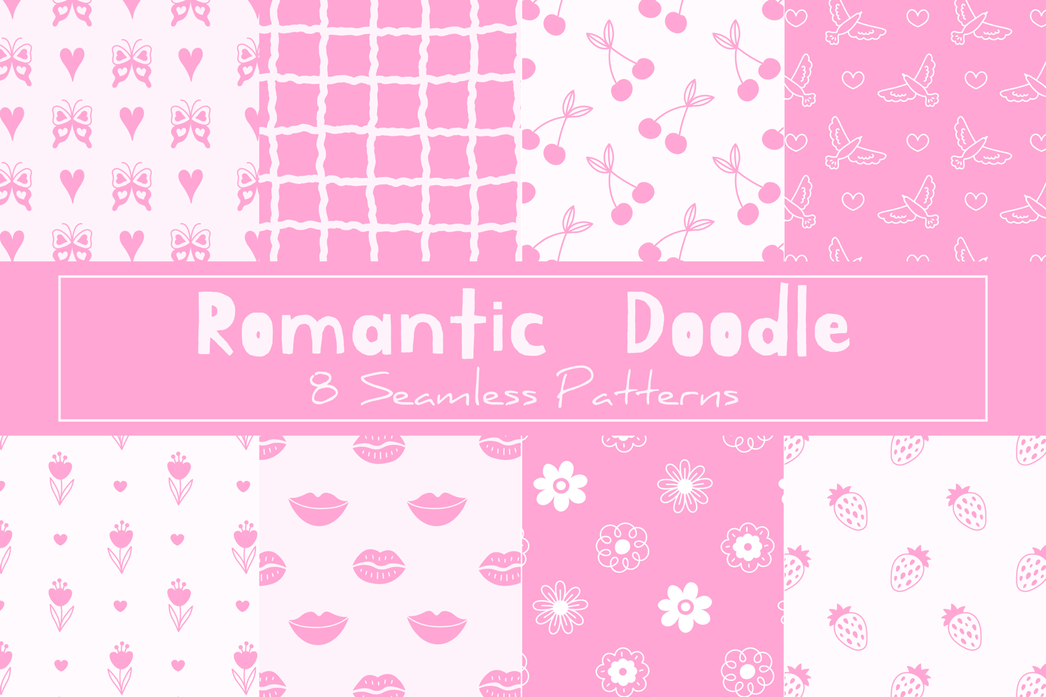 Bring a touch of romantic, girly, and playful charm to your creative projects with this Romantic Doodle Seamless Patterns collection. Designed in a sweet pastel pink palette, these hand-drawn, minimal, and whimsical patterns feature adorable strawberries, cherries, butterflies, flying birds, doves, flowers, hearts, lips, kisses, and sketchy grid elements. Each design has a soft scribble and sketch feel, giving your work a cute kawaii, fun, and slightly childish aesthetic while keeping it stylish and modern.