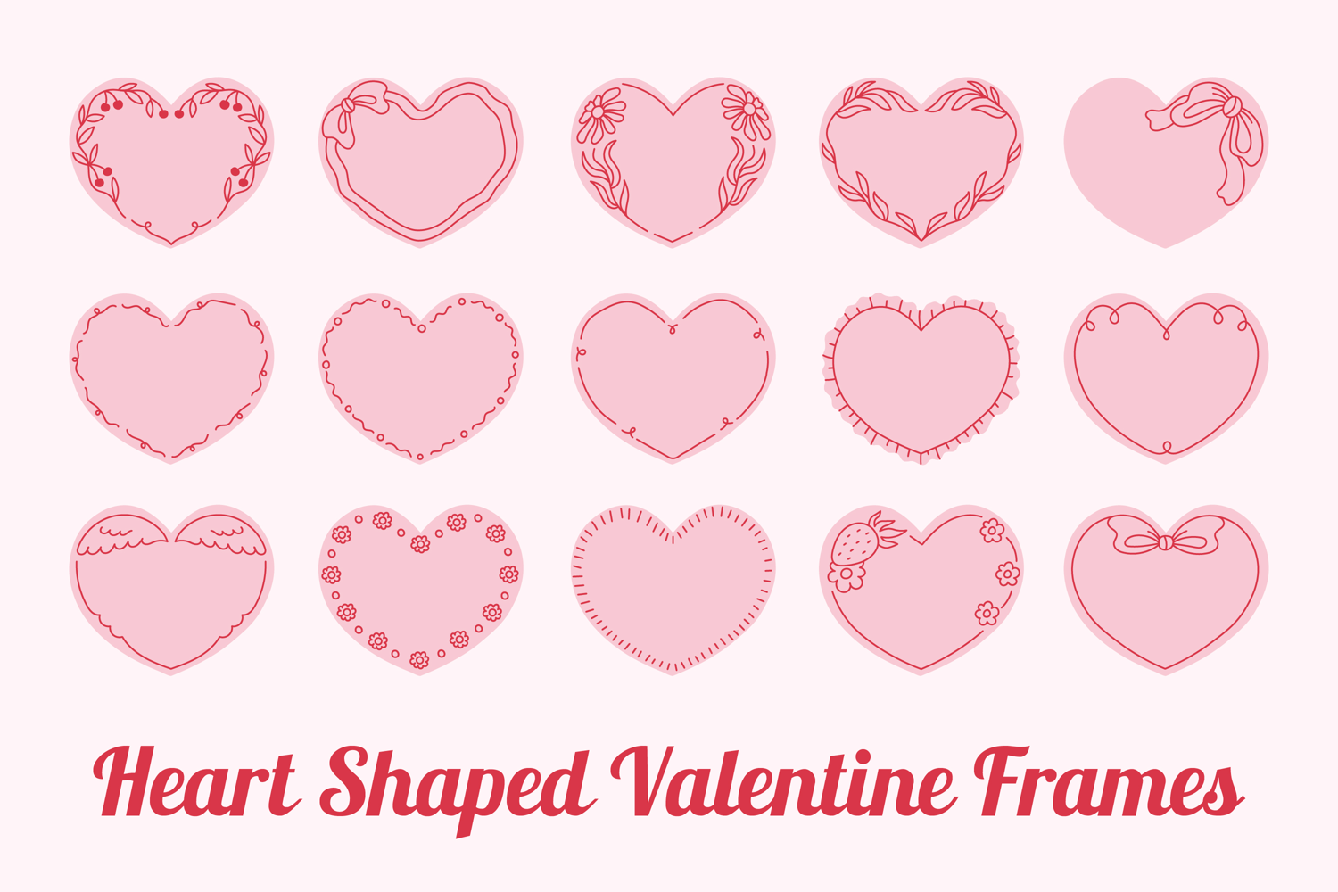 Add a touch of girly, feminine, and romantic charm to your Valentine’s Day projects with this delightful collection of Heart Shaped Valentine Frames. Each frame is hand drawn in a soft pastel pink palette and decorated with cute coquette elements like curly lines, bows, ribbons, flowers, daisies, botanical vines, wavy outlines, and whimsical sketch-style details. These empty heart templates are perfect as copy space for text, quotes, messages, invitations, or personalized notes.