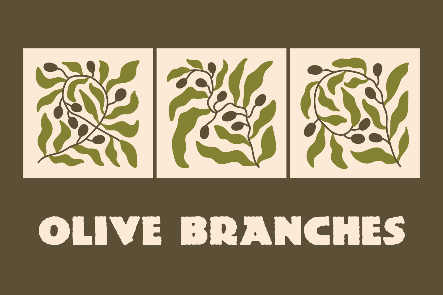 Bring warm Mediterranean charm into your design with this Olive branches set inspired by Matisse and vintage retro aesthetics. This collection features hand drawn organic shapes, flowing wavy and curly leaves, and rich green botanical elements arranged in a simple minimal abstract composition.