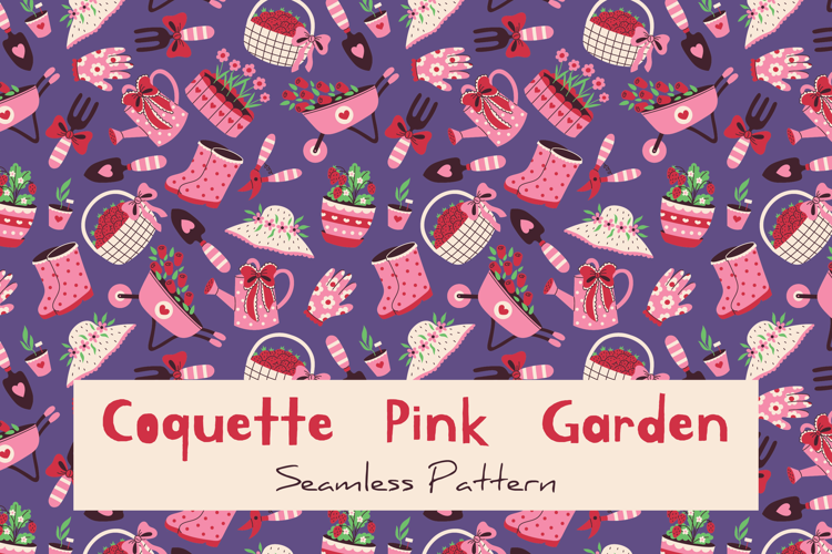 This Pink Gardening Seamless Pattern is a charming and aesthetic Background inspired by romantic cottagecore life. Featuring pretty gardening elements like a watering can, glove, wheelbarrow, flowers, seedling, trowel, fork, strawberry, pot, hat, pruner, and delicate bows, ribbons, knots, and lace details, this design brings a soft countryside mood to your projects.