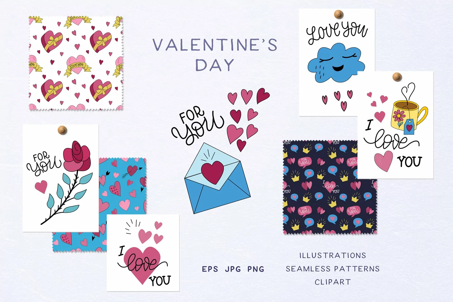 This collections includes Valentine’s graphic elements, pre-made cards and seamless patterns.