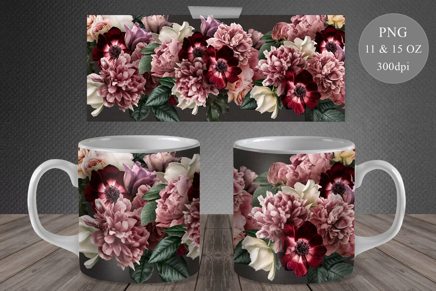 Floral Mug Sublimation. Roses, Peony, Anemone Mug Wrap