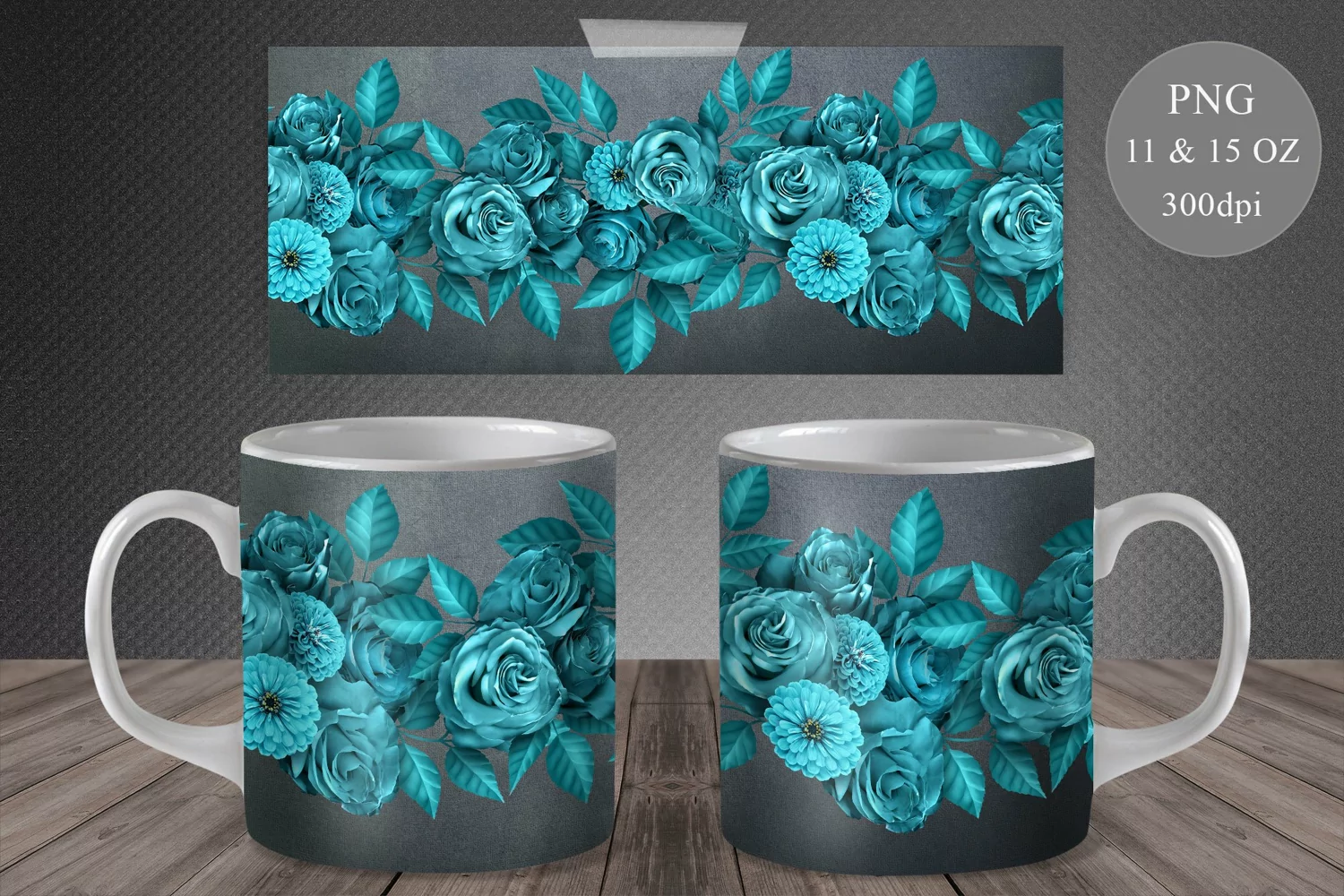 Teal Roses Mug Sublimation. Teal Flowers Mug Wrap 11 & 15 OZ example image 1