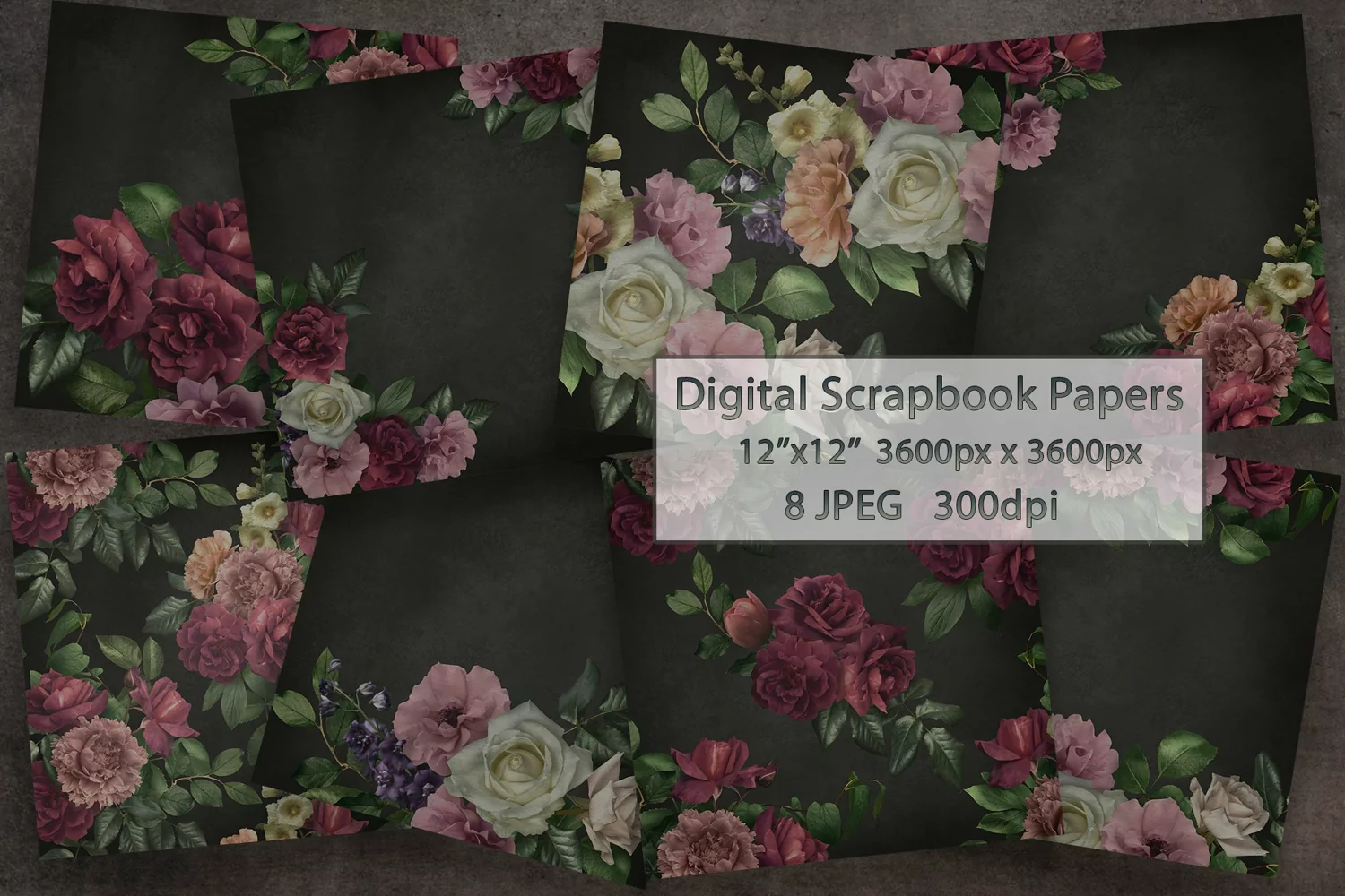 This moody floral paper perfect for digital scrapbooking, DIY, printables, wedding invitations, greeting cards, paper crafts, and more! Includes 8 papers.