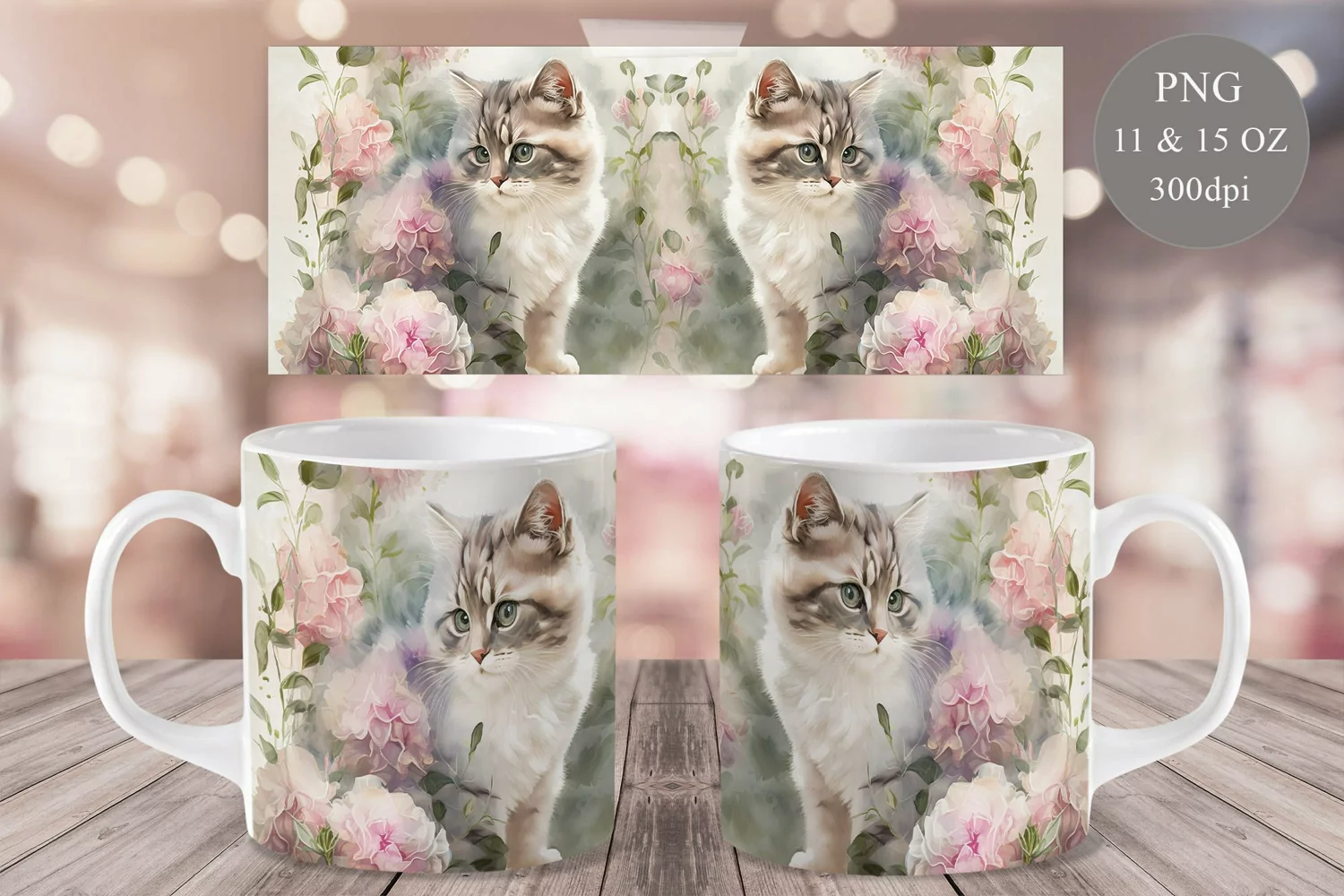 Cute Cat Mug Sublimation | Watercolor Mug Wrap 11 & 15 oz example image 1