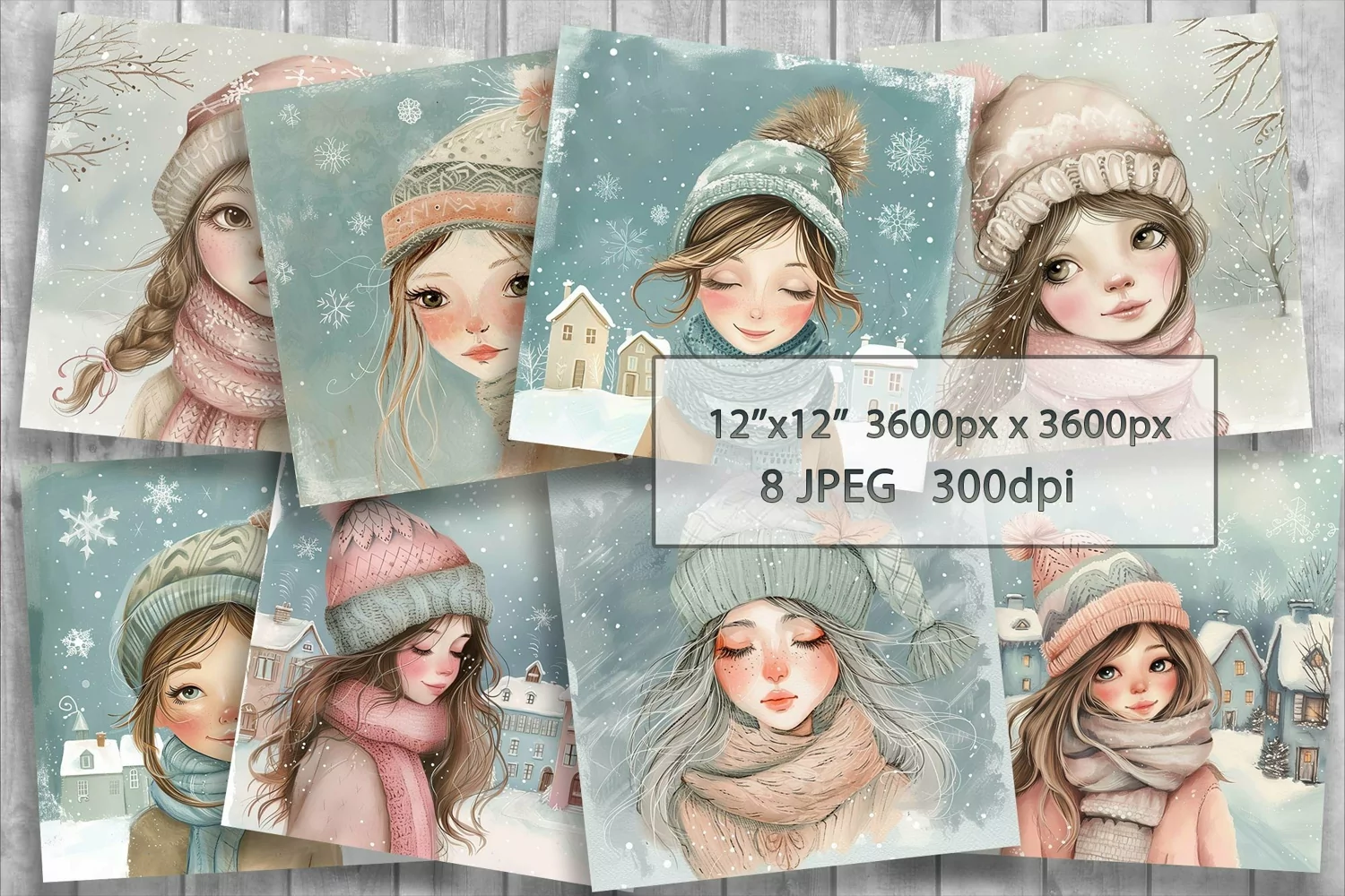 Cute Winter Girls Digital Papers, Illustrations, Cards